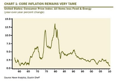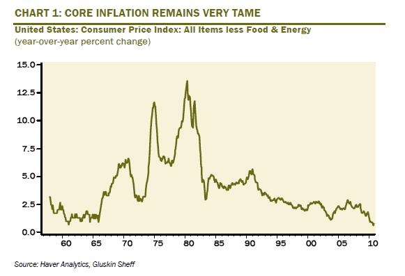 Last Thurday, David Rosenberg wrote an article entitled, "Inflation, Where is Thy Sting?" (subscription required). He outlined his bull case for bonds by showing the chart below of core CPI and went on to comment that there are many disinflationary and deflationary forces at work in the economy.