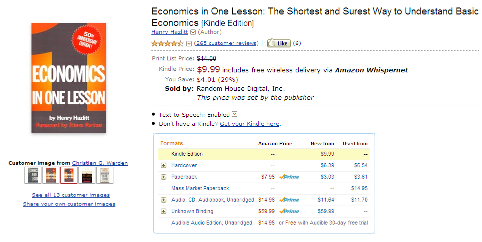 new from Amazon in paperback for $7.95... or at $9.99 for the Kindle. Apparently, "Economics In One Lesson" either doesn't include a section on pricing... or whoever did the pricing on the book didn't read that section...